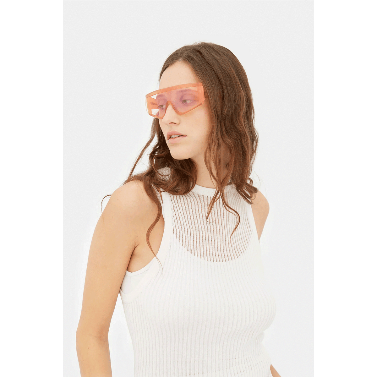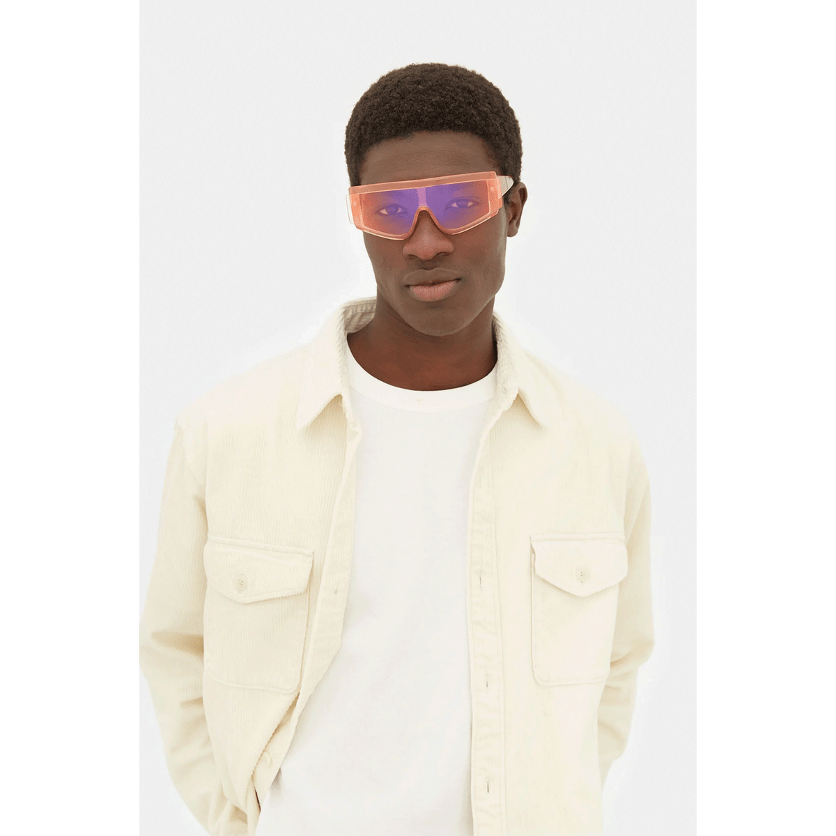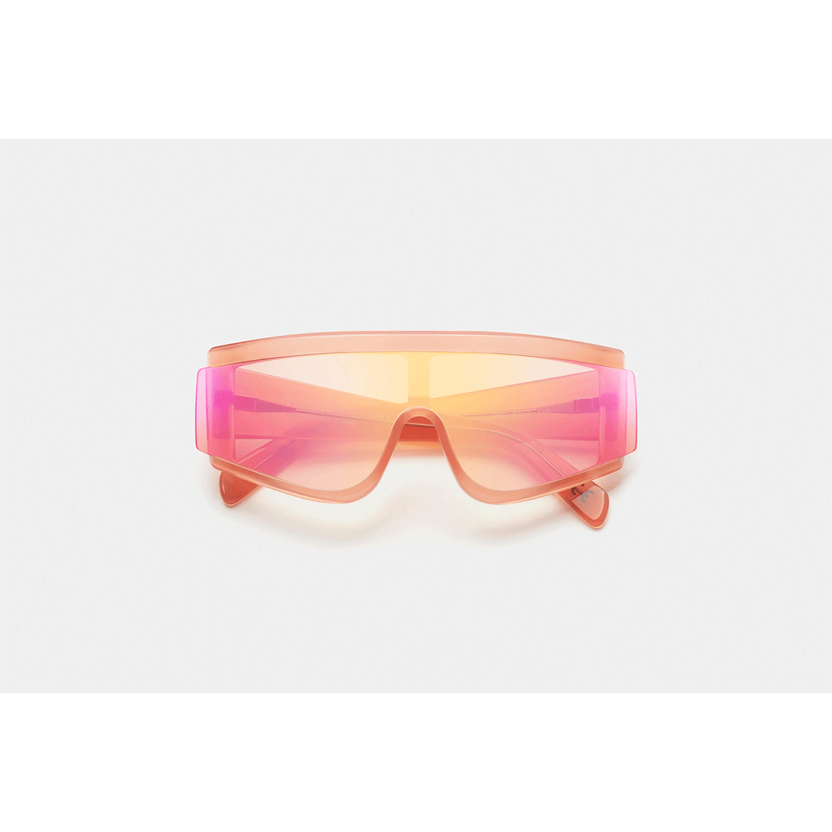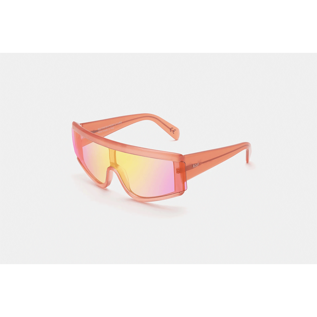 ZED is a fast-riding, forward-looking, fluid silhouette that sits at the intersection of urban lifestyle and high-tech sportswear. Conceived as one of RSF’s first shields in the mid-2010s, ZED has been updated with a sharp new identity. Characterised by a thick acetate construction, whose crafted structure reveals both soft rounded corners as well as precise angles, embraces the single lens tightly in place. A sharp detail: the geometric extended lens on the exterior of the frontal frame. This version comes in a colourful crystal peach acetate with lightly mirrored peach lenses.