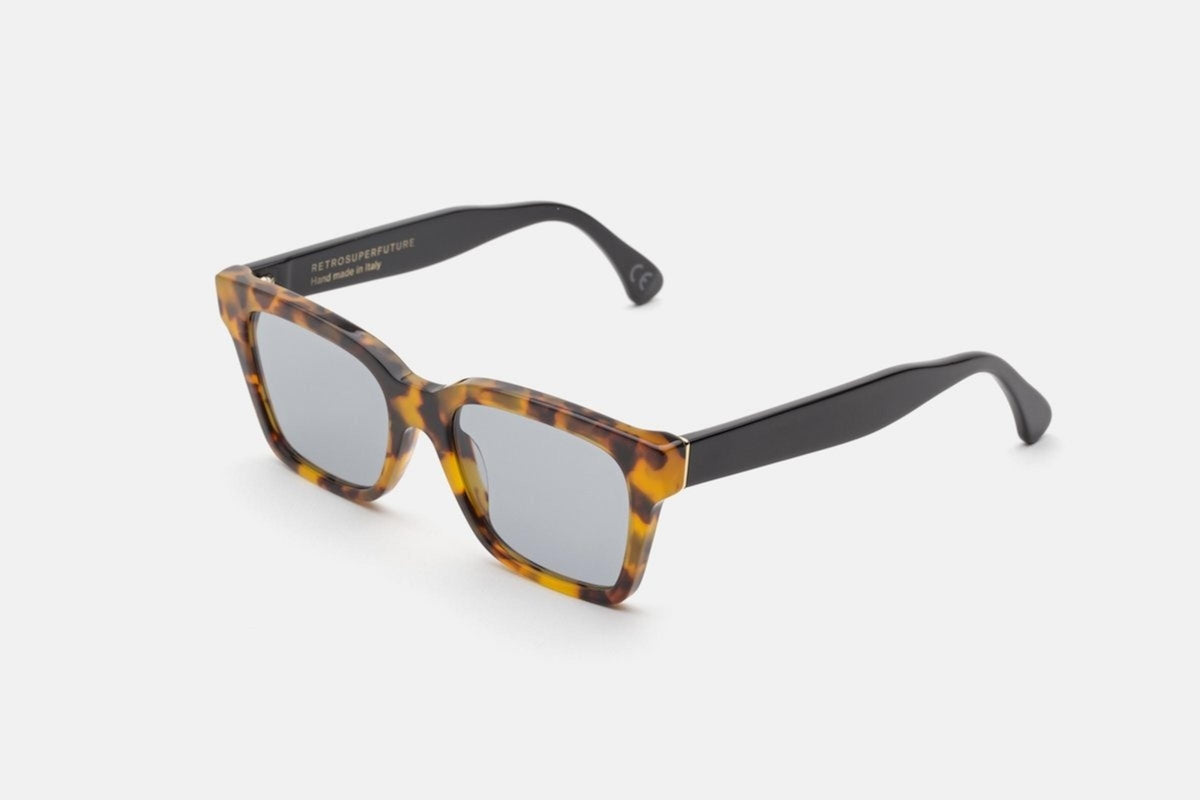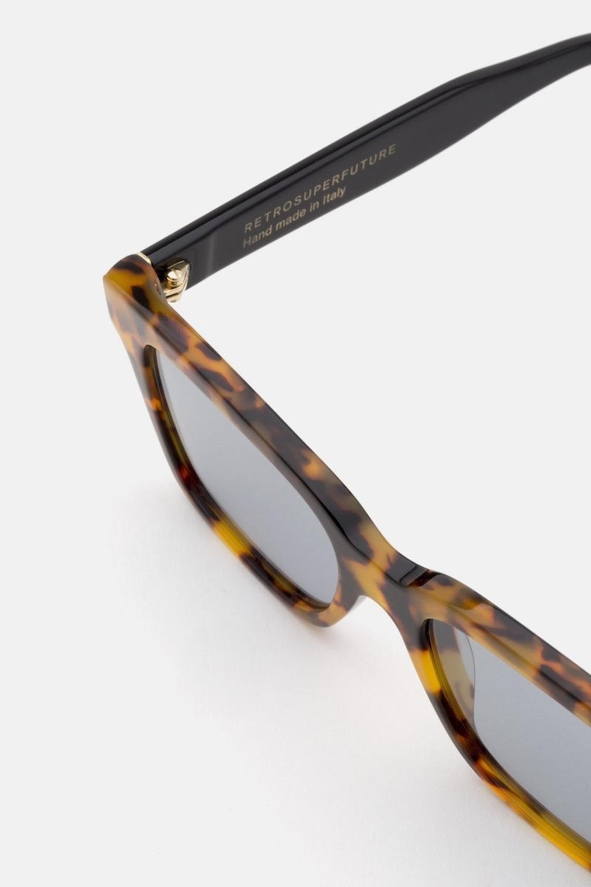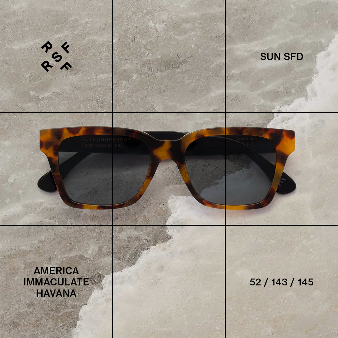 A fresh and sleek reinterpretation of one of RSF’s most iconic silhouettes: America. A classic angular design, America features sturdy rims, essential profile and wide lenses. This version of the silhouette was matched with light grey tinted lenses, a shiny black acetate front and Havana temples. The box contains a semi-hard case and a cleaning cloth.