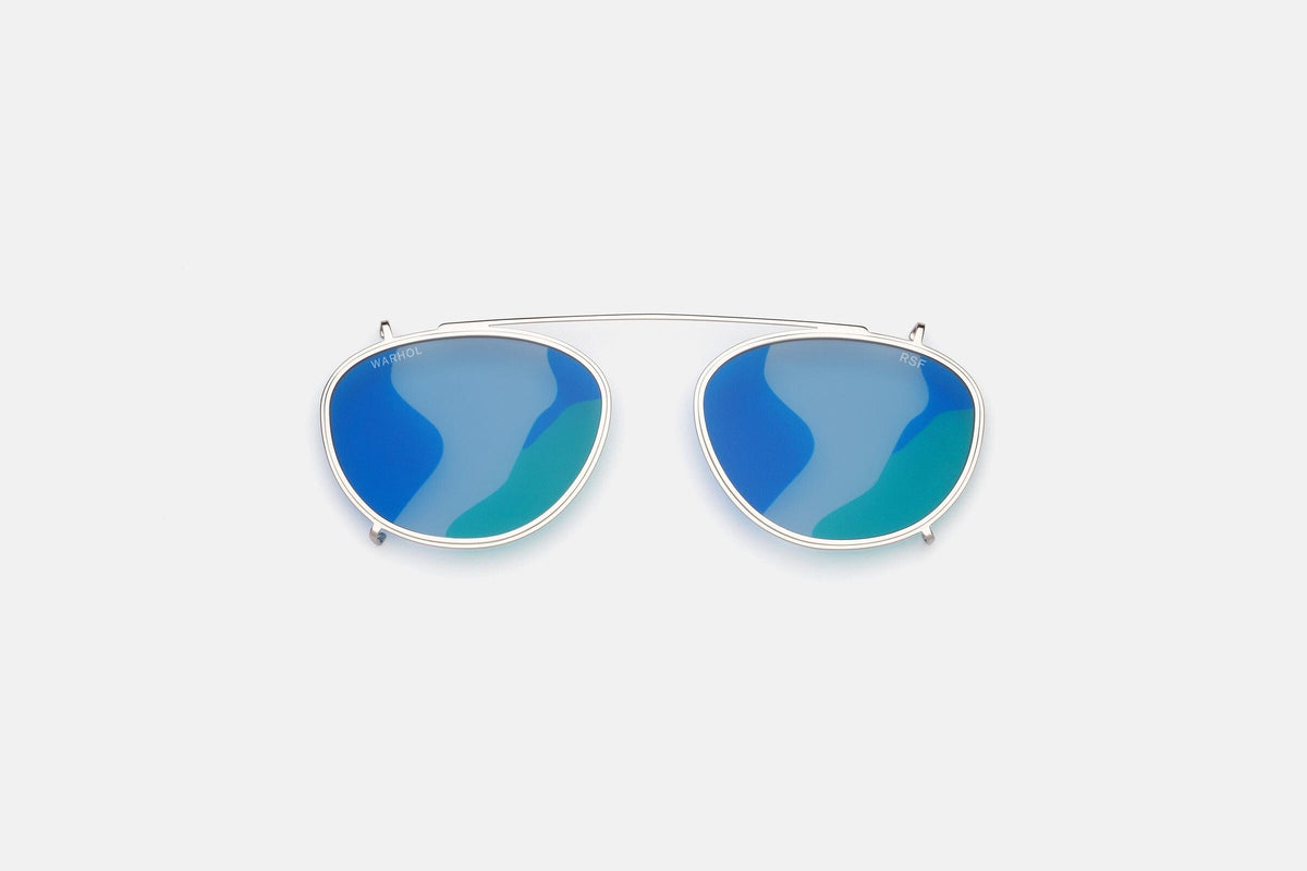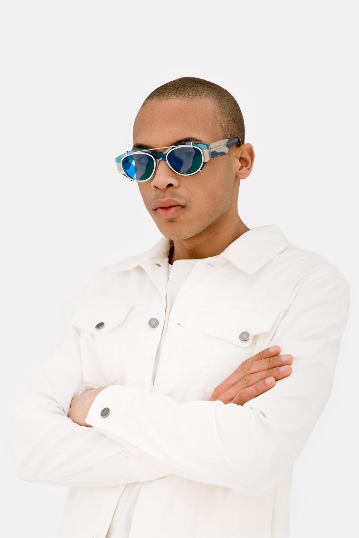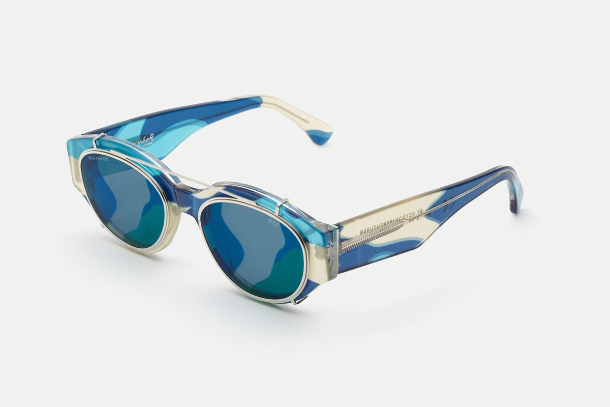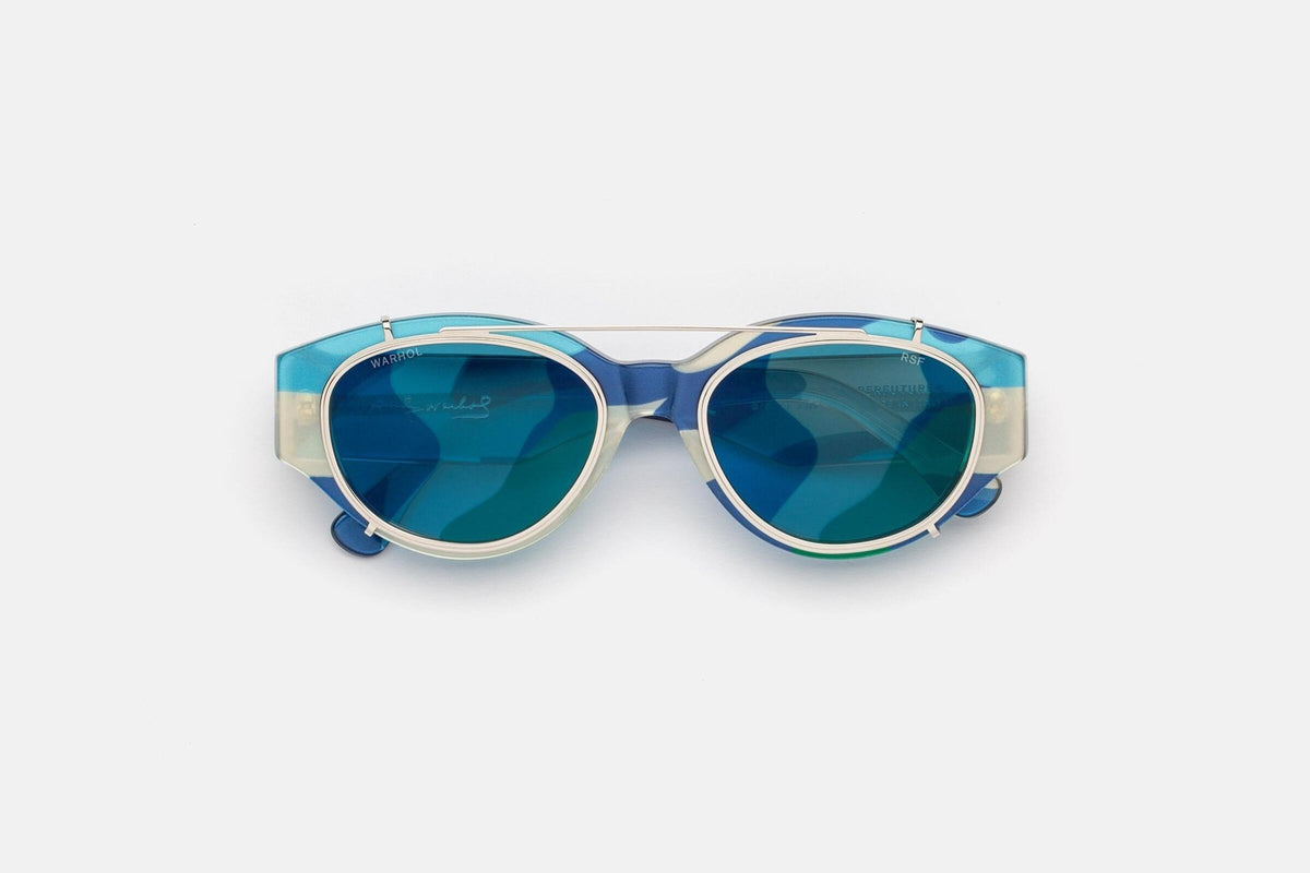 Designed in collaboration with The Andy Warhol Foundation for the Visual Arts, this version of Drew Mama features an abstract print of Warhol’s camouflage paintings from the 1980s. Using HD technology, the project ironically underlines the concept of camouflaging oneself by having the artwork printed all-over: interior, exterior of the acetate frame, temples and matching camo printed clip-on lenses. This Drew Mama mounts Andy Warhol’s blue camouflage with light grey lenses.