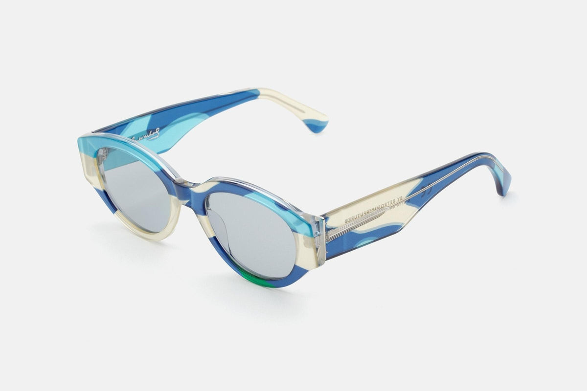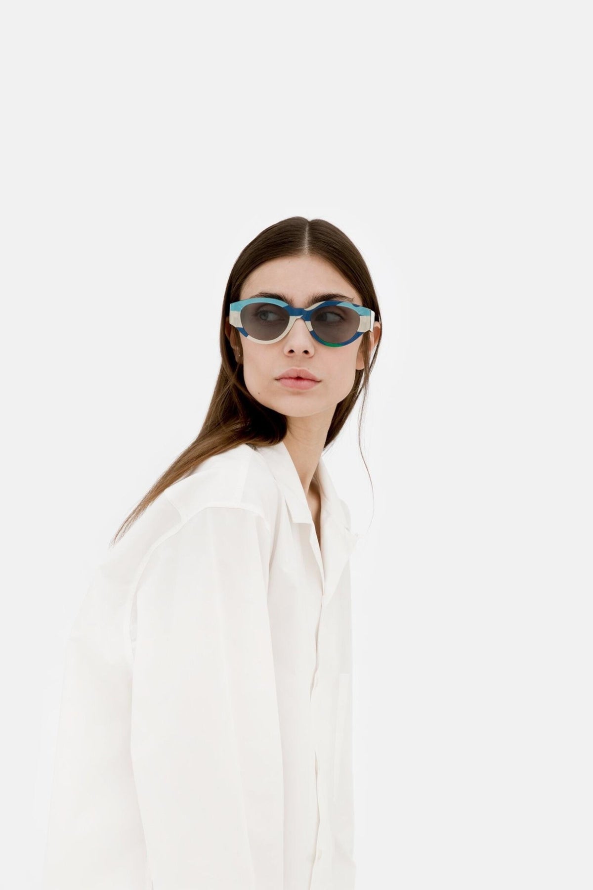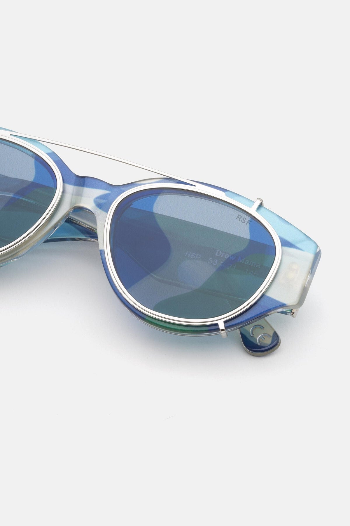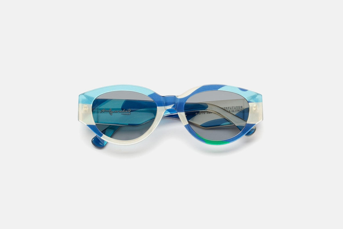 Designed in collaboration with The Andy Warhol Foundation for the Visual Arts, this version of Drew Mama features an abstract print of Warhol’s camouflage paintings from the 1980s. Using HD technology, the project ironically underlines the concept of camouflaging oneself by having the artwork printed all-over: interior, exterior of the acetate frame, temples and matching camo printed clip-on lenses. This Drew Mama mounts Andy Warhol’s blue camouflage with light grey lenses.