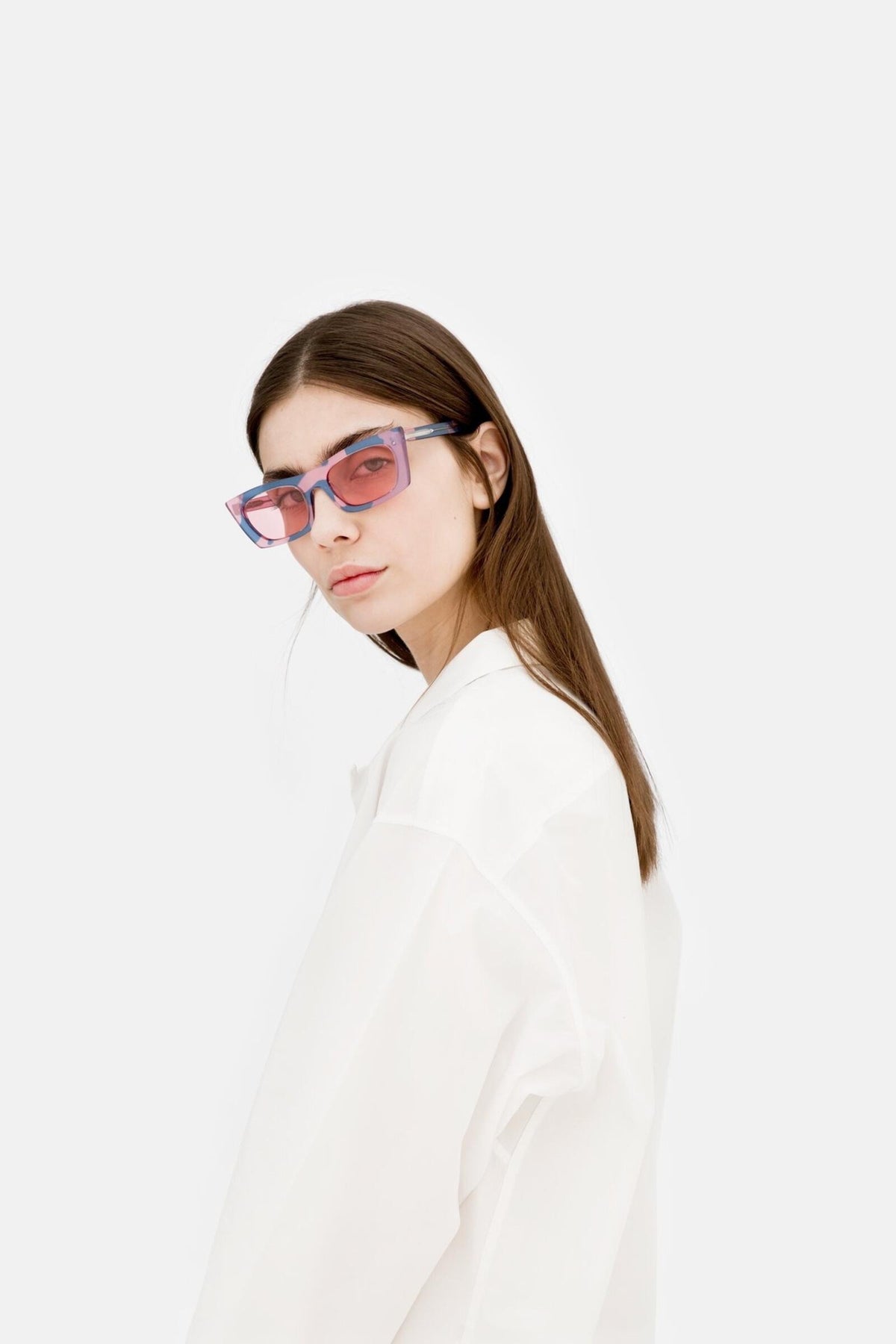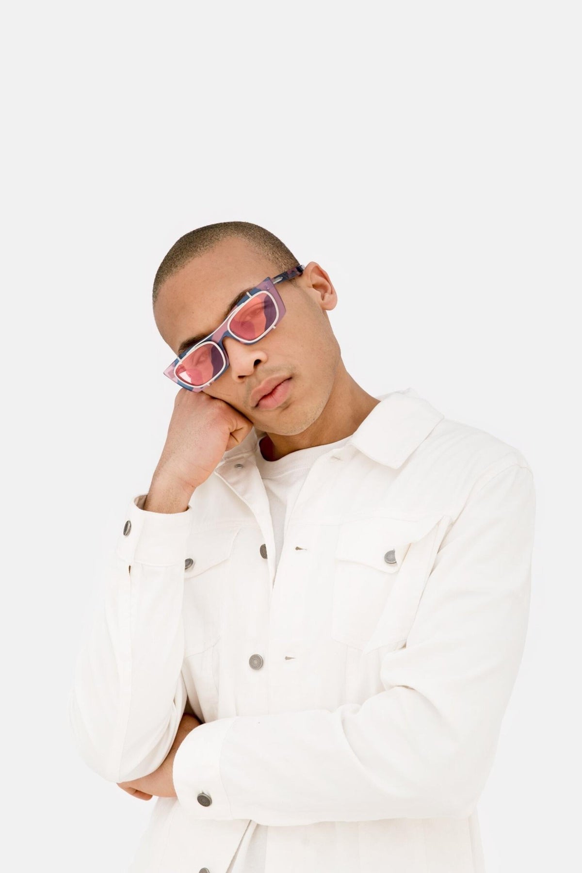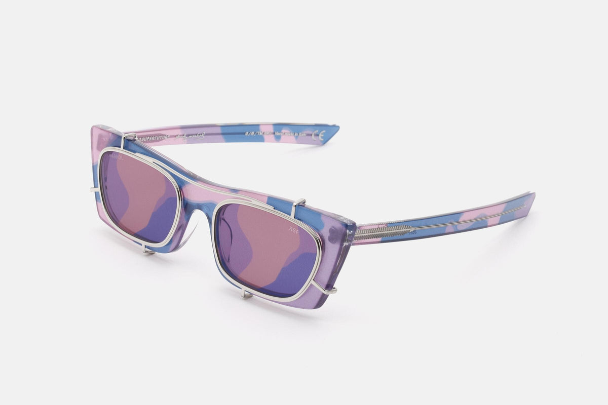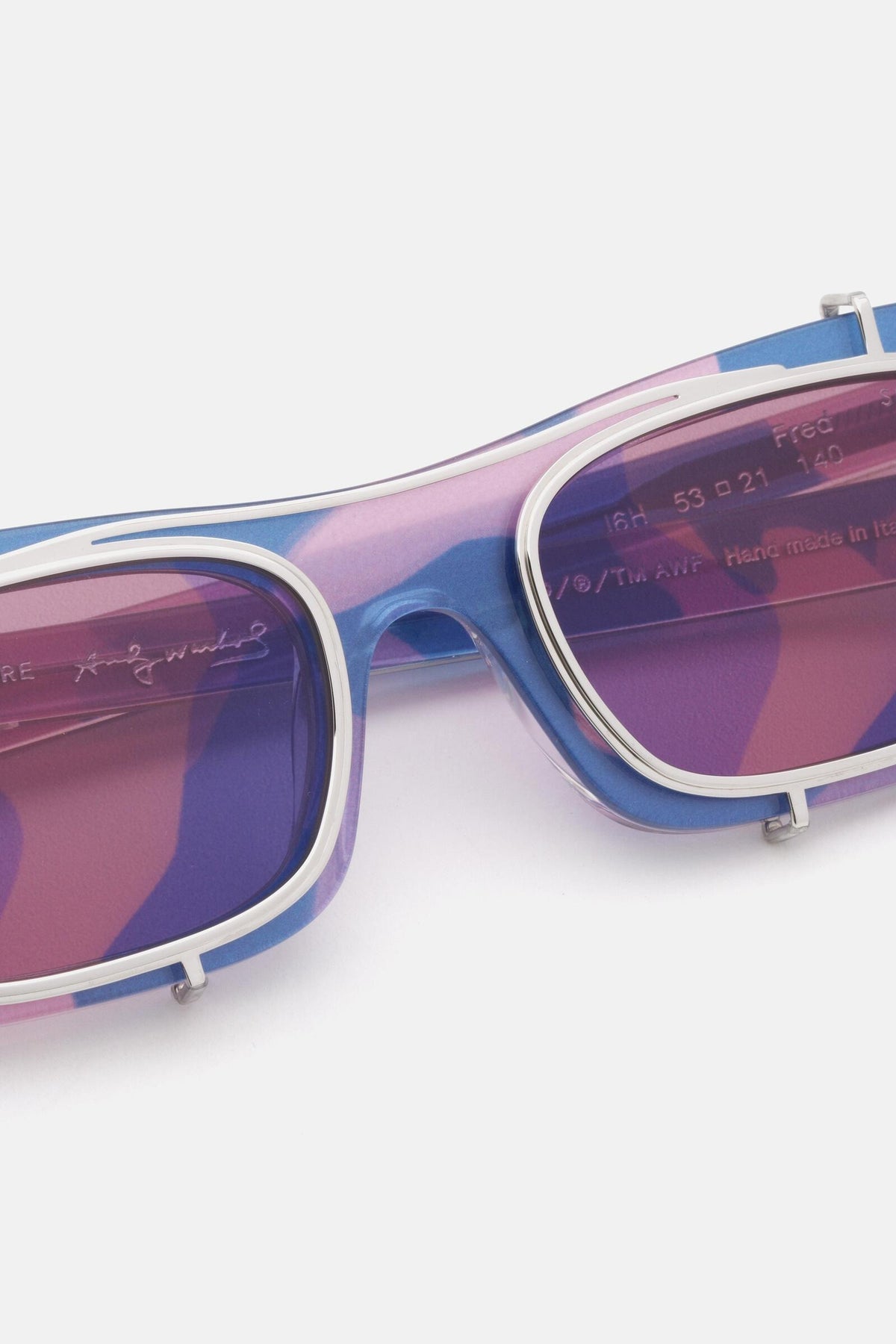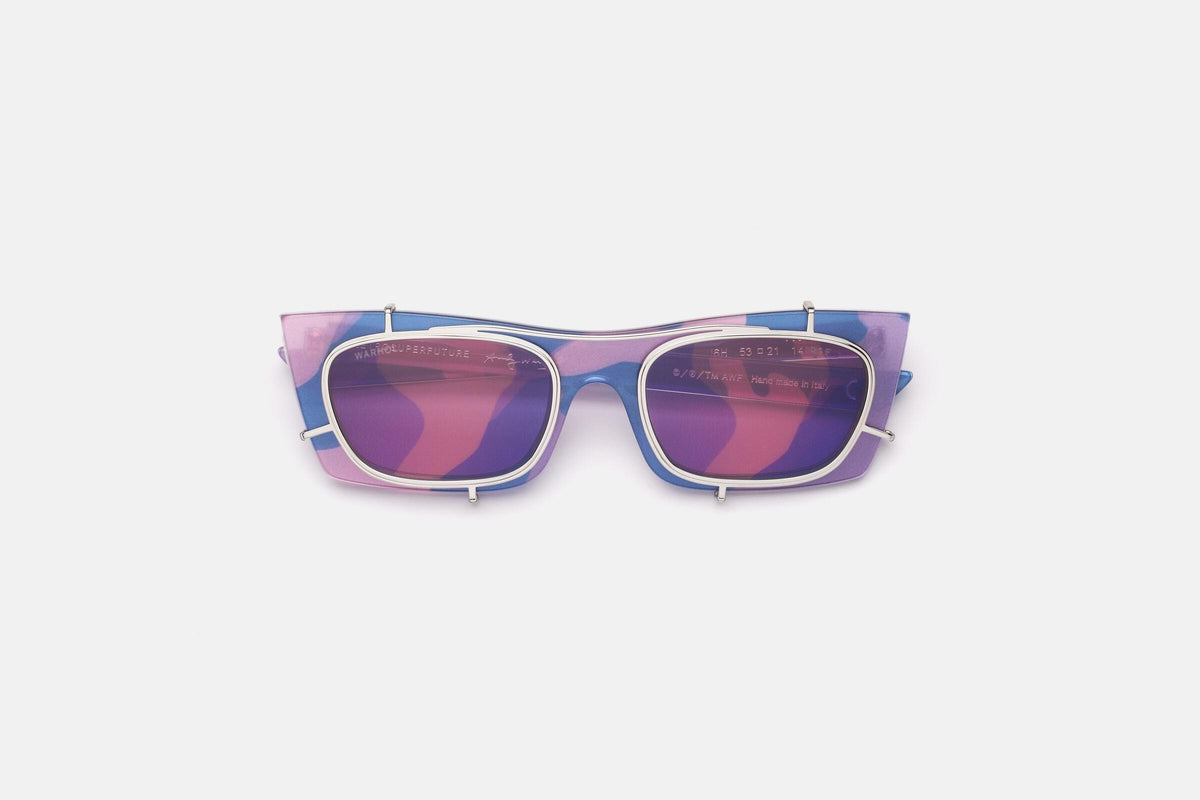 Designed in collaboration with The Andy Warhol Foundation for the Visual Arts, this version of Fred features an abstract print of Warhol’s camouflage paintings from the 1980s. Using HD technology, the project ironically underlines the concept of camouflaging oneself by having the artwork printed all-over: interior, exterior of the acetate frame, temples and matching camo printed clip-on lenses. This Fred mounts Andy Warhol’s pink camouflage with pale pink lenses.