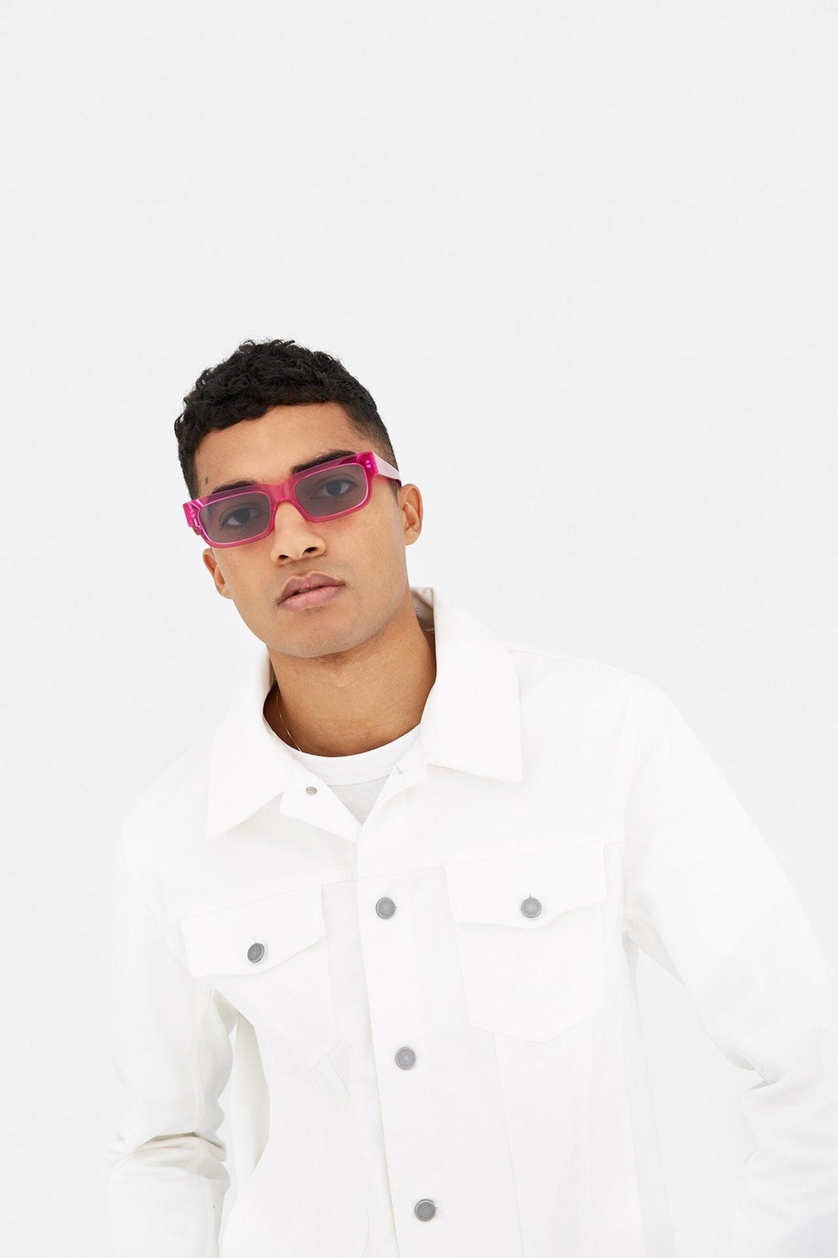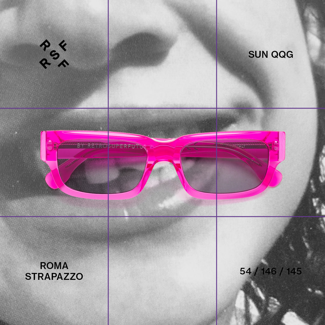 Roma is a cutting-edge model that unites the low-riding eyewear with a fresh and bold classic attitude. With its thick rims and squared lines, Roma is a fearless piece of eyewear. This model comes with bright pink acetate and grey tinted lenses. The box contains a semi-hard case and a cleaning cloth.