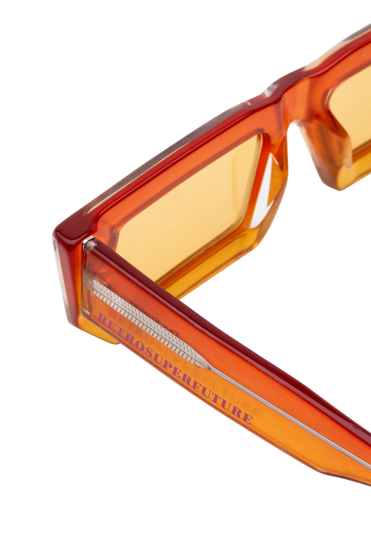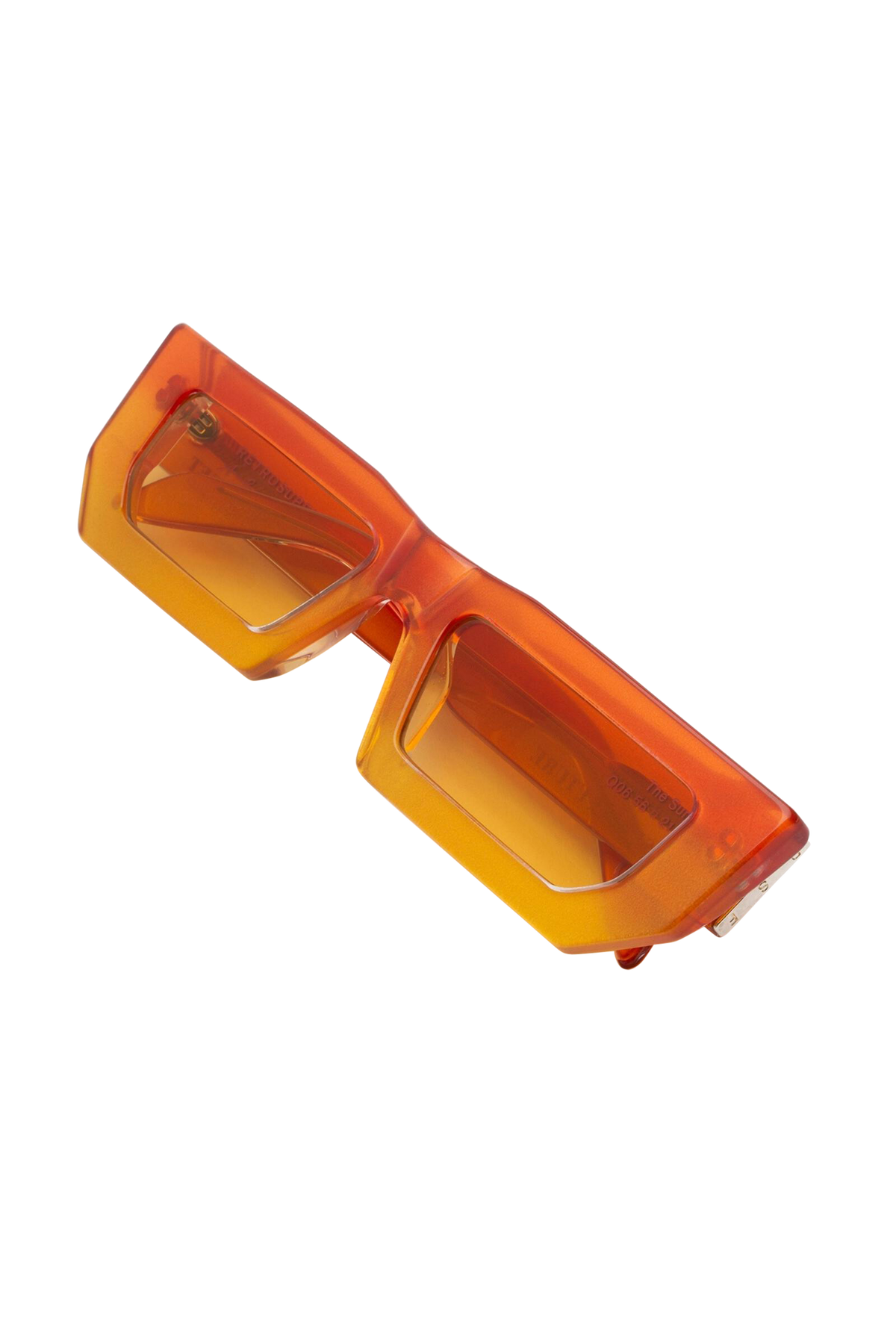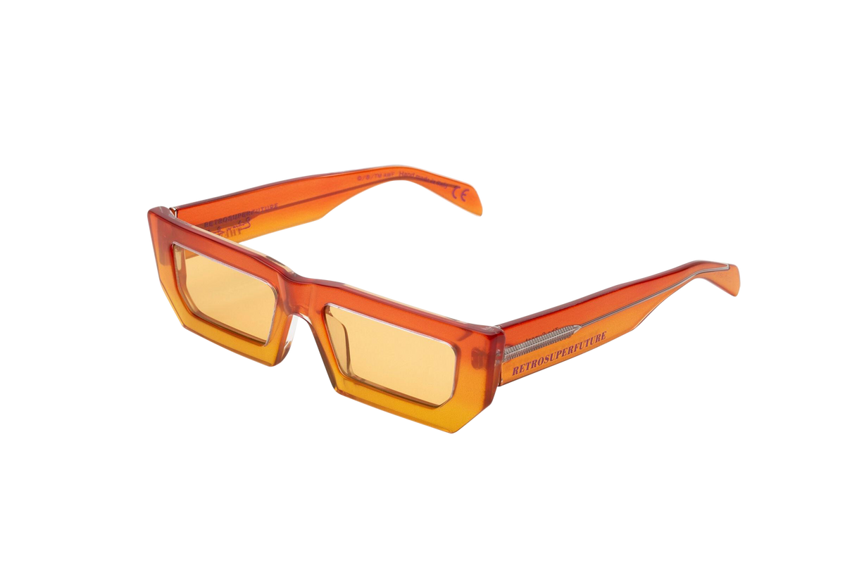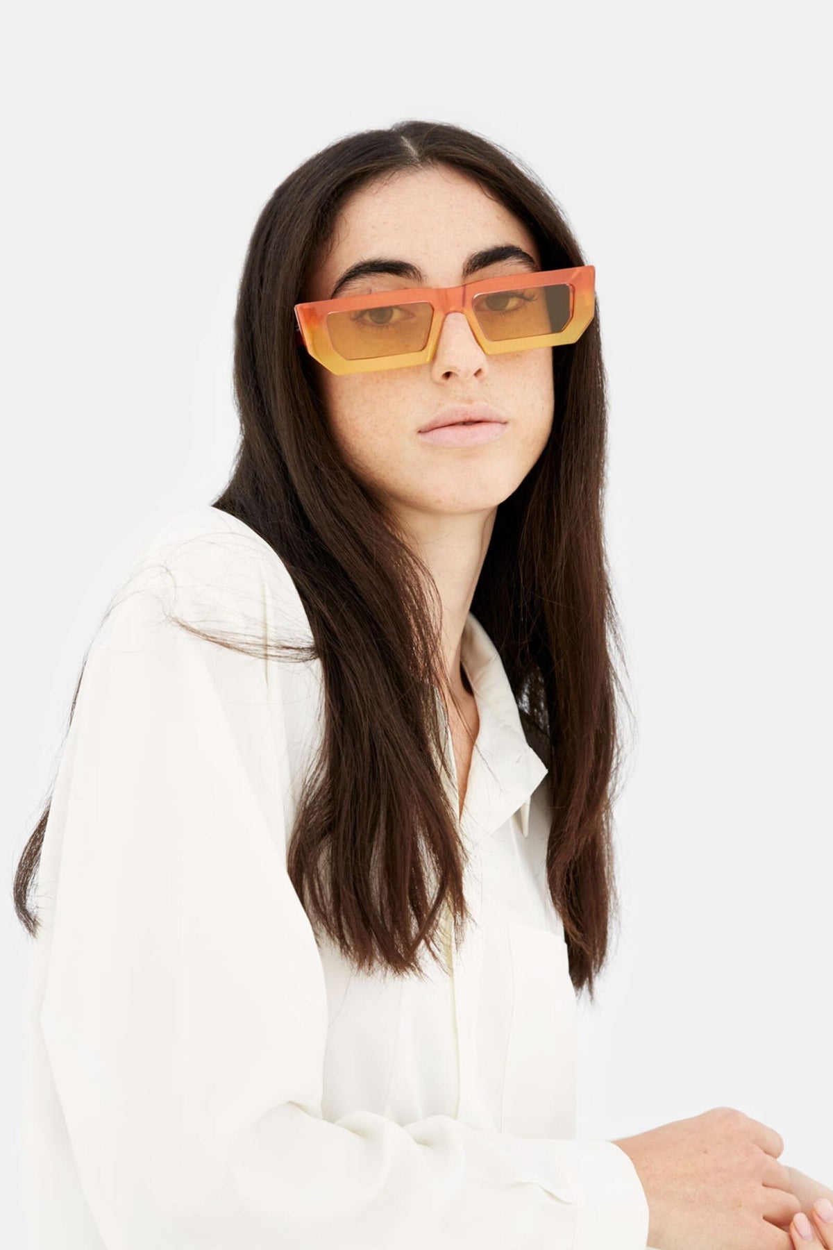 The silhouette is a bold angular shape that reinterprets classic 1970s styles with a contemporary feel, with wide lenses, low nose- bridge and thick arms. This model features Warhol’s yellow and orange Sunset printed on the acetate frame, with matching orange lenses.