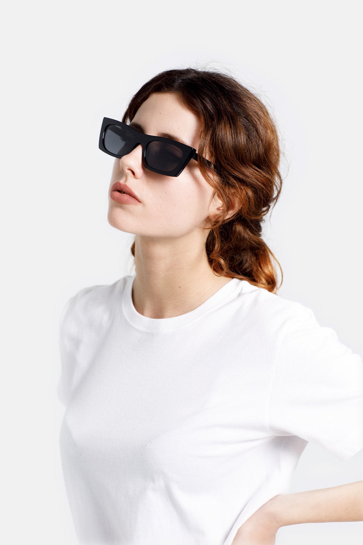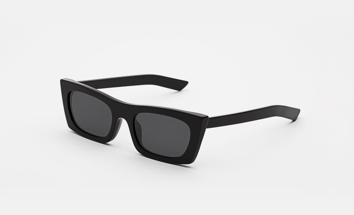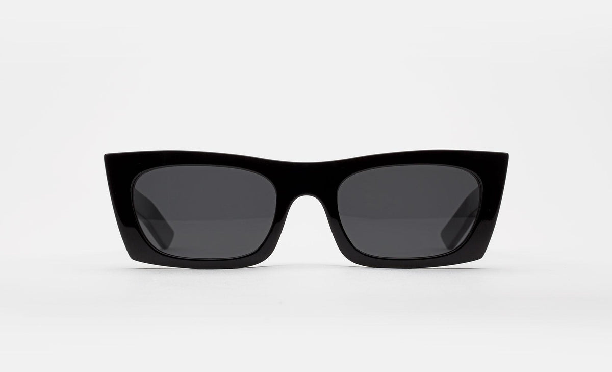 A bold model, the Fred features a silhouette defined by its sharp angles, and flaunts a sculptural profile. Presented in a glossy Black acetate with matching black lenses. The box contains a semi-hard case and a cleaning cloth.