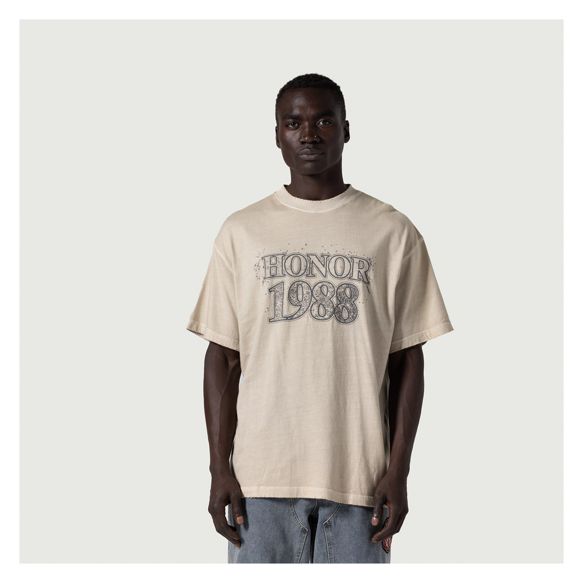 The Vibe Higher tee is a premium short sleeve crewneck that features faded logo graphics on the front. Constructed from premium 7oz cotton jersey, cut to a boxy custom fit and garment dyed for a vintage feel.