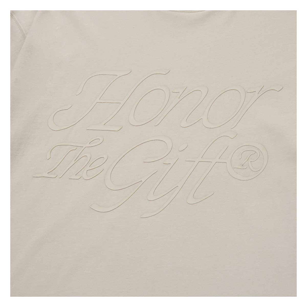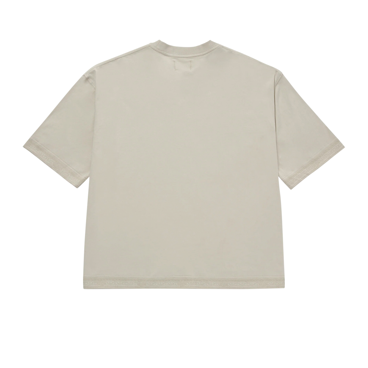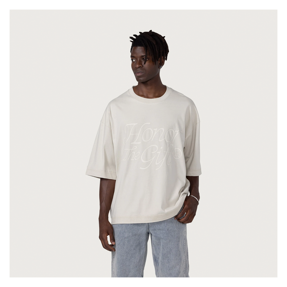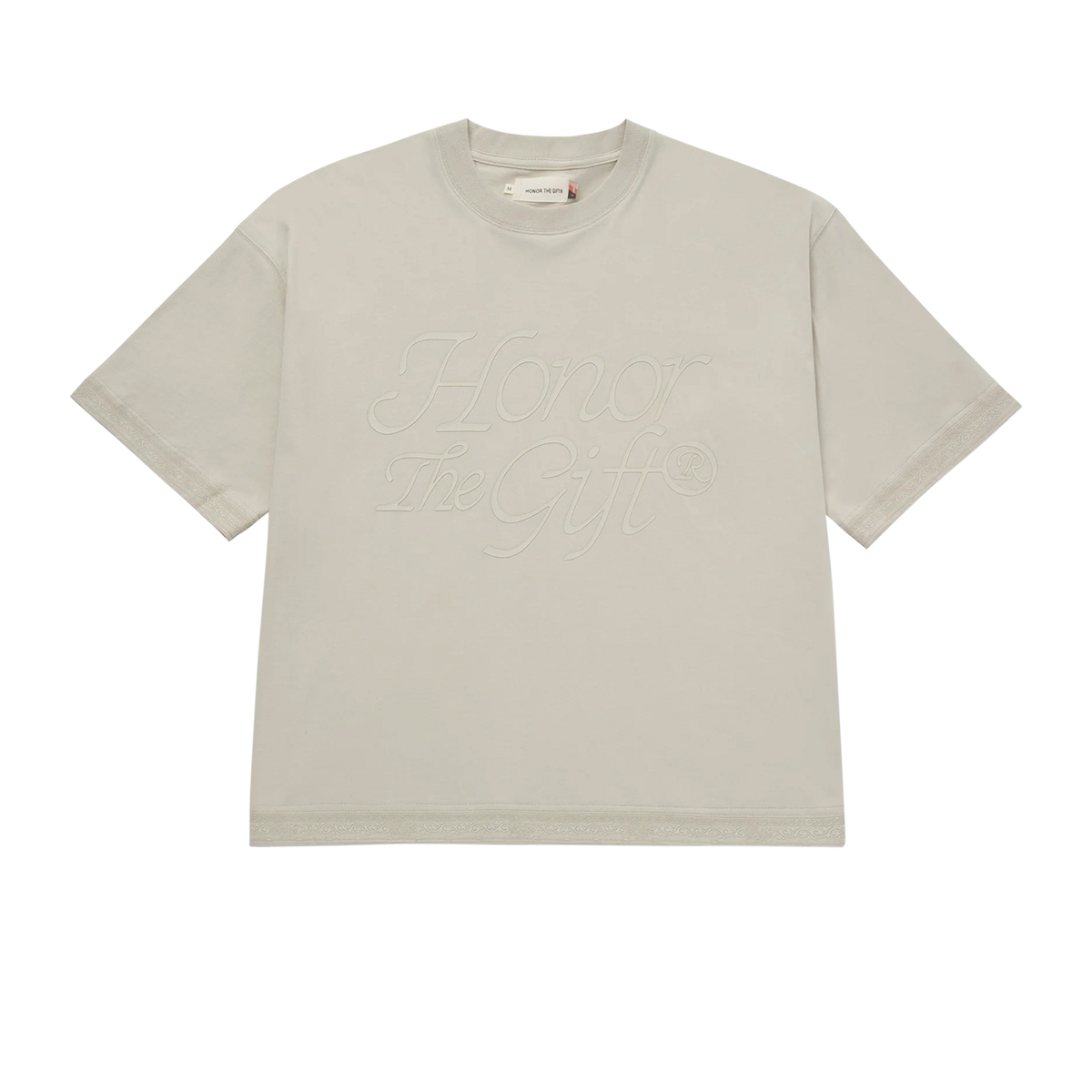 The HTG H Box tee is a premium short sleeve crewneck, cut to a boxy custom fit and garment dyed for a vintage feel. Featuring tonal high-density printed graphic logo on the front, and an intricate pattern around the cuff and hemlines.