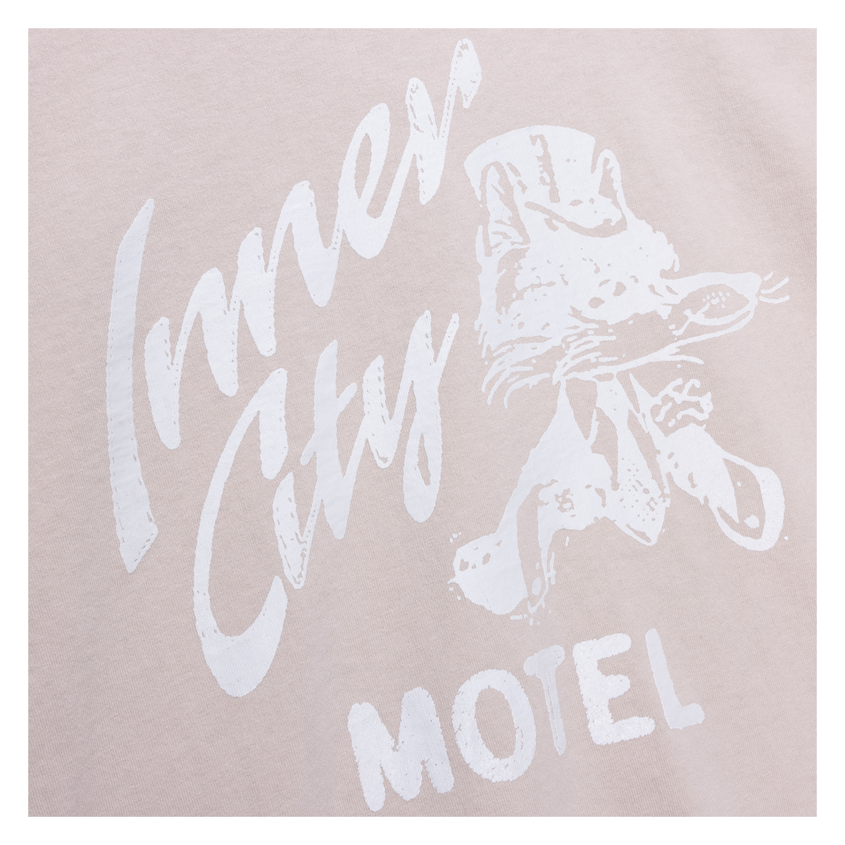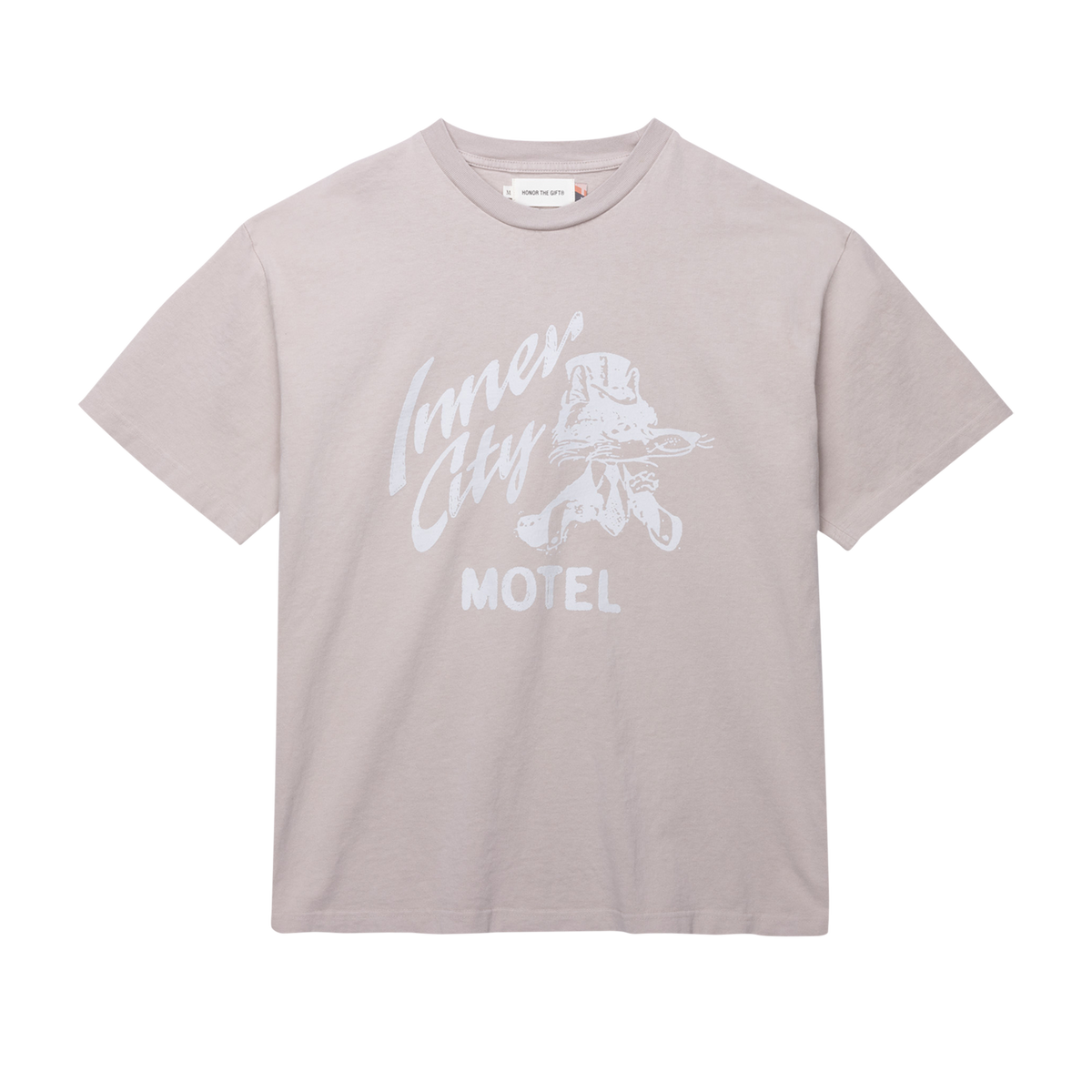 The Inner City Motel Tee by Honor the Gift is a premium short sleeve tee, cut to a custom boxy fit and garment dyed for a vintage look and feel. Features screen printed graphics on the front and back.
