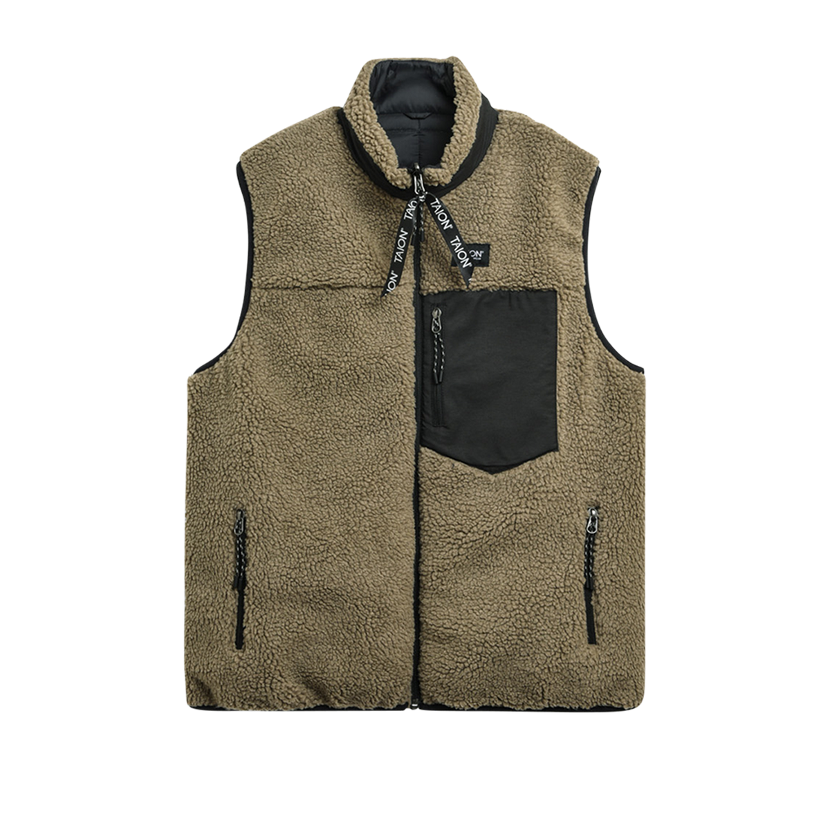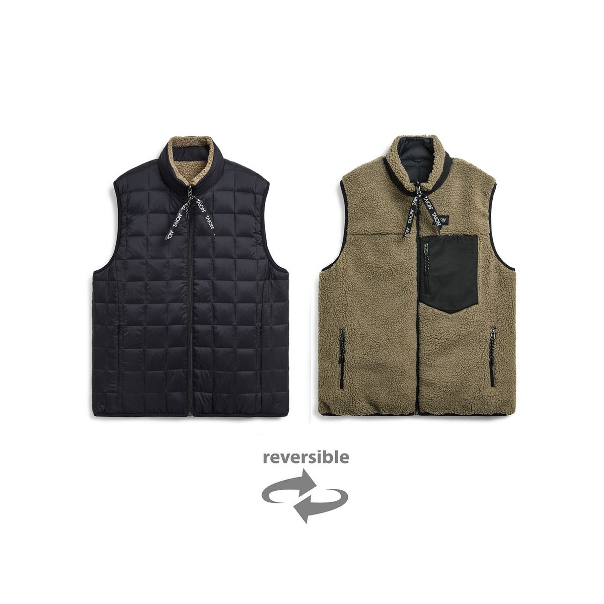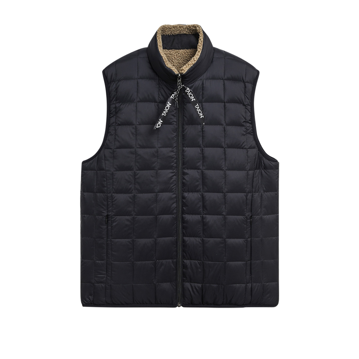 This reversible vest is crafted from black nylon with rectangular-baffled down fill, making it both warm and lightweight, as well as water repellant. The reverse side is constructed from polyester fleece for added warmth, with a patch chest pocket and zippered hand pockets.