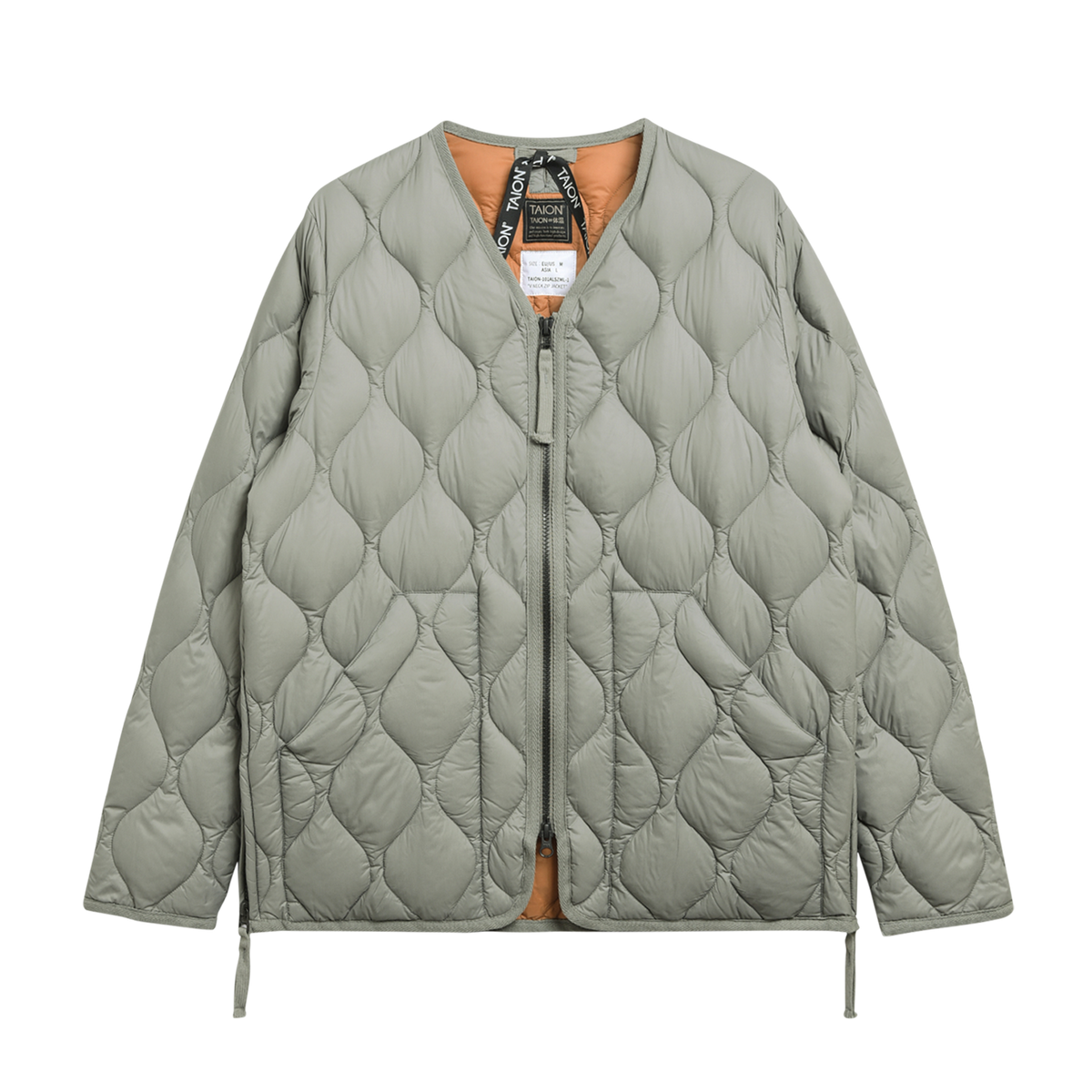 This Military V-Neck liner jacket is crafted from soft-touch nylon with an onion-patterned quilted down fill, making it both warm and lightweight, as well as water repellant.