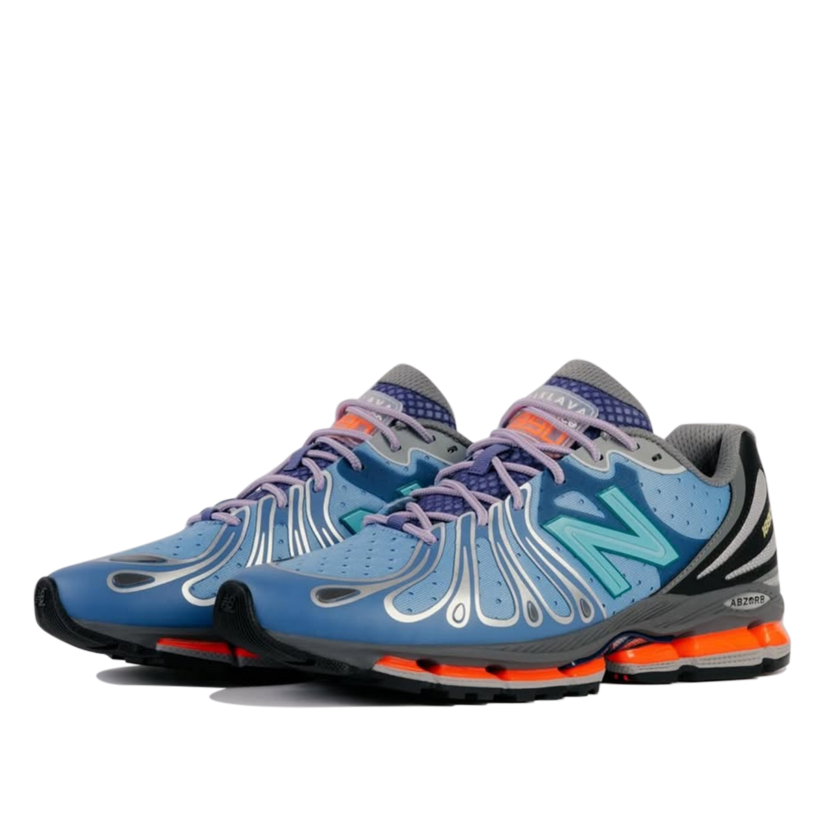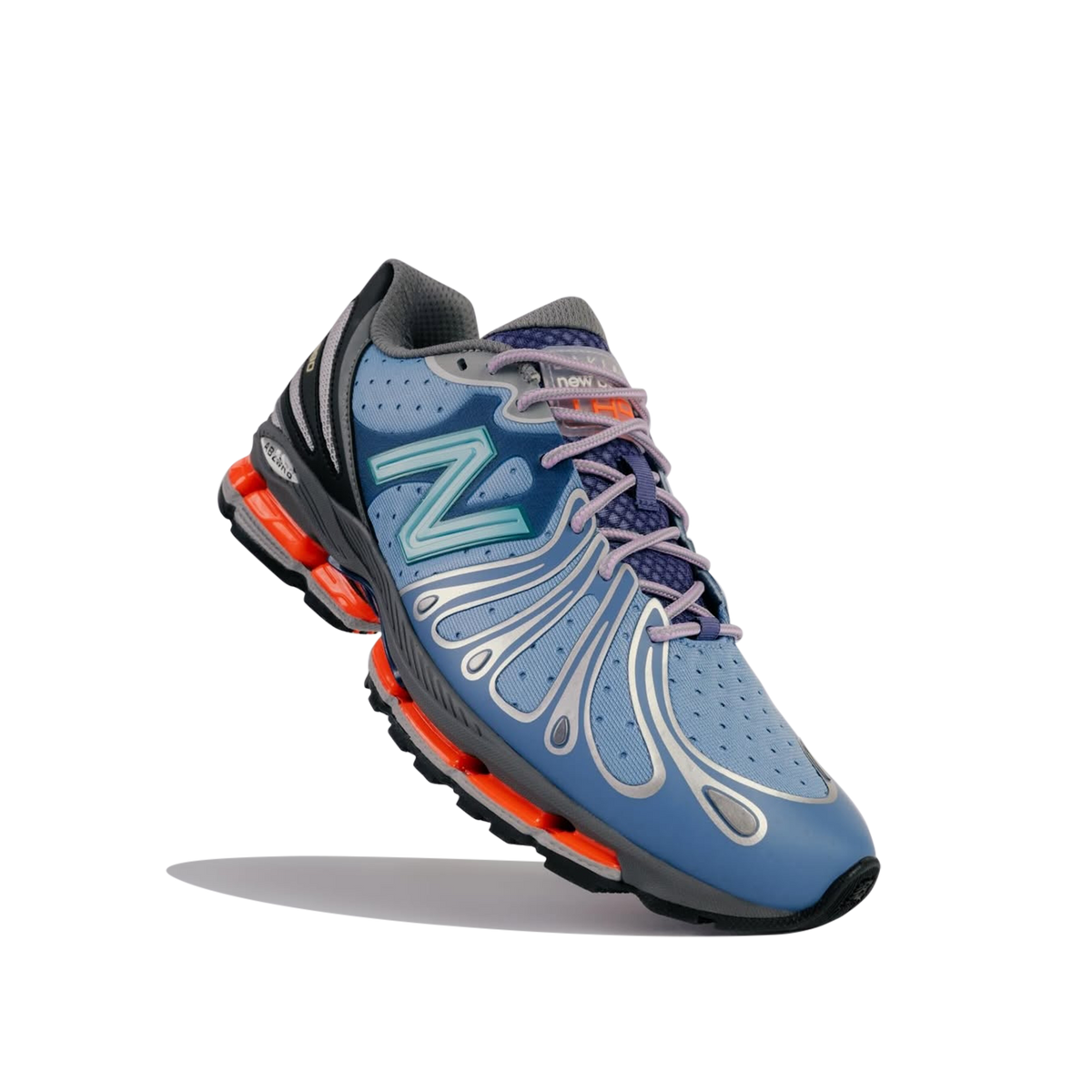 Bronson continues his exploration of colours with his first take on New Balance's 1890. The 'Cyborg Tears' colourway is an exciting portrait of blues. The wavy overlay along the upper is outlined in a metallic silver, creating a visual pop. The cool tones are contrasted with flash of poppy red along the sole, and stark black on the base and heel.