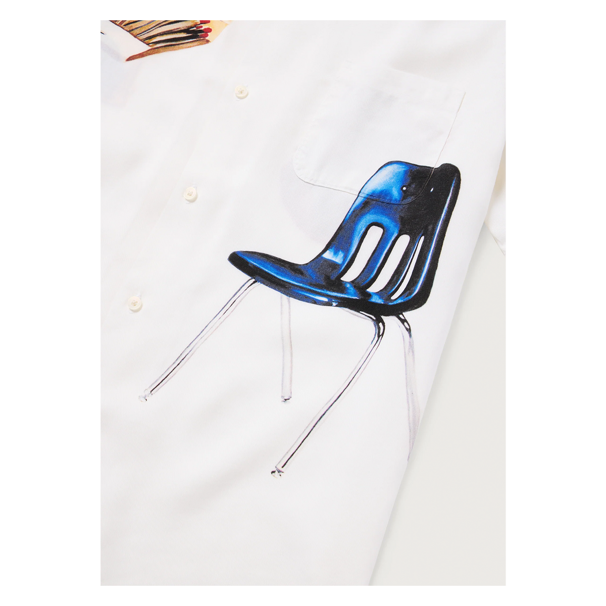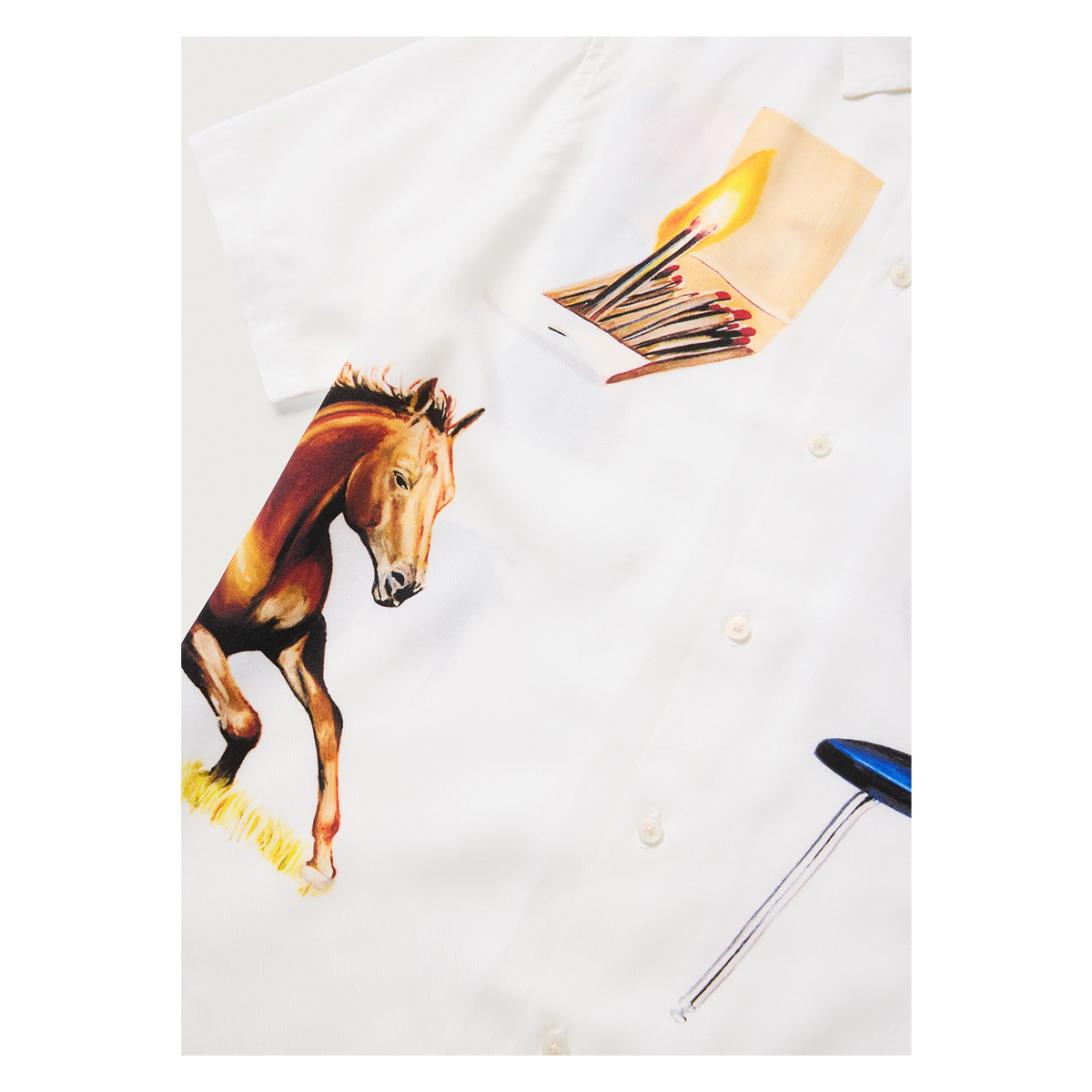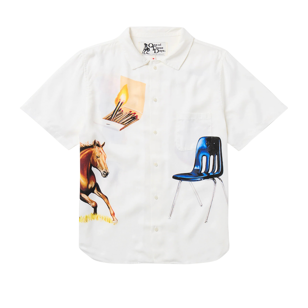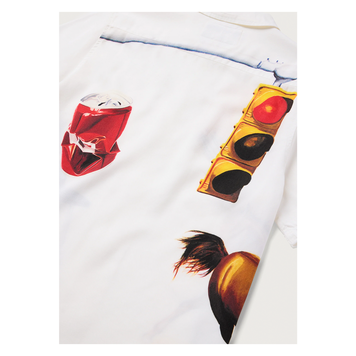 The "I Never Believed In Much, But I Believe In You" camp shirt is cut from Tencel and featuress digital print artwork from Matt McCormick's archive. The shirt is finished with 2-hole pearl buttons and pick-stitch detailing on the sleeve and collar.